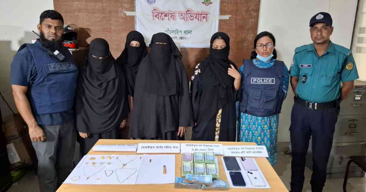 চট্টগ্রাম নগরের পাঁচলাইশ এলাকার একটি বাসা থেকে প্রায় ৫০ ভরি স্বর্ণ চুরির ঘটনায় মূল অভিযুক্ত গৃহপরিচারিকার মেয়েসহ মোট চার নারীকে গ্রেপ্তার করেছে পুলিশ। এ সময় তাদের কাছ থেকে ১৬ ভরি স্বর্ণ, স্বর্ণ বিক্রির নগদ অর্থ এবং সেই টাকায় কেনা আইফোনসহ অন্যান্য মোবাইল ফোন উদ্ধার করা হয়েছে।