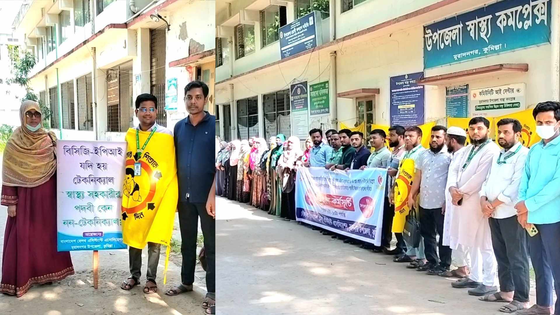 মঙ্গলবার সকালে মুরাদনগর উপজেলা স্বাস্থ্য কমপ্লেক্সের সামনে এ মানববন্ধন ও অবস্থান কর্মসূচি পালন করে বাংলাদেশ হেলথ অ্যাসিস্টেন্ট এসোসিয়েশন মুরাদনগর উপজেলা শাখা।